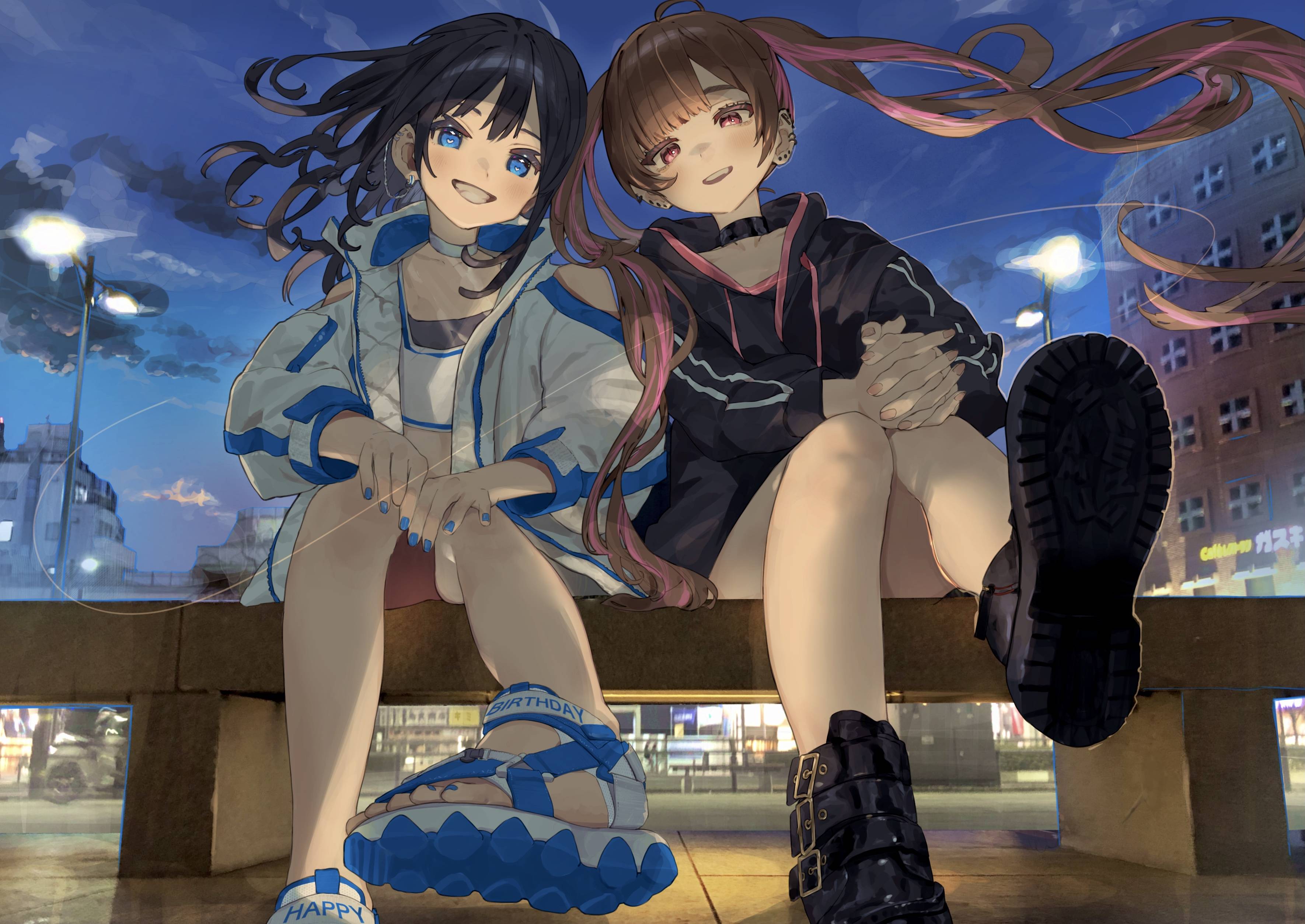 女孩子 黑发 双马尾 美甲(脚趾) 连帽衫 穿洞